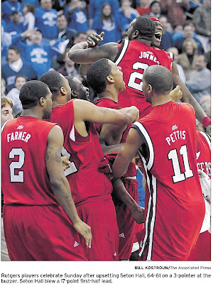 Rutgers had to score quickly and did so when Beatty banked in another three to make it 75-73, but there were just 6.3 seconds left. Rutgers quickly fouled Corey Fisher who only made one of the two shots, giving Rutgers a chance for a desperation three point attempt. Beatty got the ball into the forecourt and kicked it back to Mitchell who was on the far right wing, well outside the three point line. Mitchell claimed he "just let fly." From where I was watching, the ball looked like it was following a homing signal to the basket. Not only did it go cleanly through the net, Mitchell was fouled on the play. After Villanova took a timeout, the Rutgers senior made the free throw with just .8 seconds on the clock. The Wildcats had time for a full court pass, but the receiver caught it out of bounds. Rutgers had won on what Jerry Carino labeled, without overstatement, "one of the greatest shots in Rutgers Men's basketball history." Likewise Mitchell acknowledged it was "definitely" the biggest shot of his life." Perhaps somewhat lost in the excitement was the fact that Rutgers had scored seven points in seven seconds, prompting Dick Jerardi of the Philadelphia News to wonder "How is that possible?"